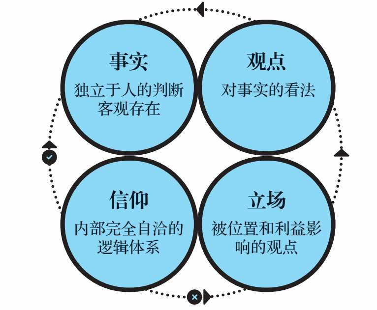 但是细究起来,还可以再细分,至少可以分为四种:事实(Fact)、观点(Opinion)、立场(Stand)和信仰(Belief)(见图2-1)。